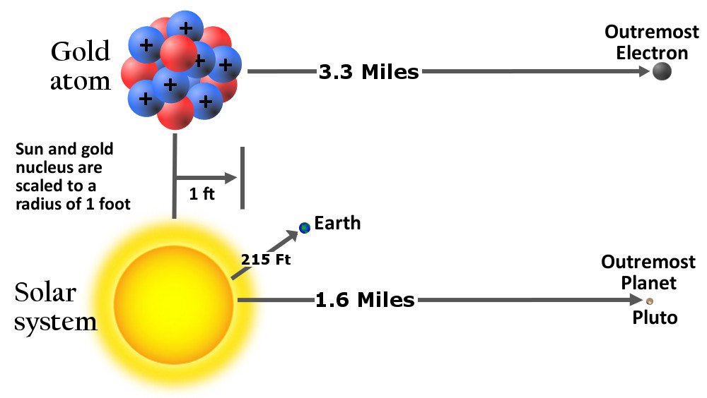 Um modelo em proporções reais do átomo de ouro, com núcleo ampliado a 30,4 cm (1 pé) teria seu elétron mais distante a 5,4 km (3,3 milhas) do núcleo. Num modelo real, com o Sol reduzido ao mesmo tamanho de 30,4 cm, o planeta-anão Plutão estaria a distância de 2,5 km (1,6 milhas) e a Terra a 653 m (215 pés). Na verdade, a distância entre a Terra e o Sol varia perto dos 150 milhões de km e o elétron está, do seu núcleo, ao dobro da distância entre a Terra e Plutão (5 bilhões de km) - logo, há muito mais vazio no micro do que no macrocosmo.